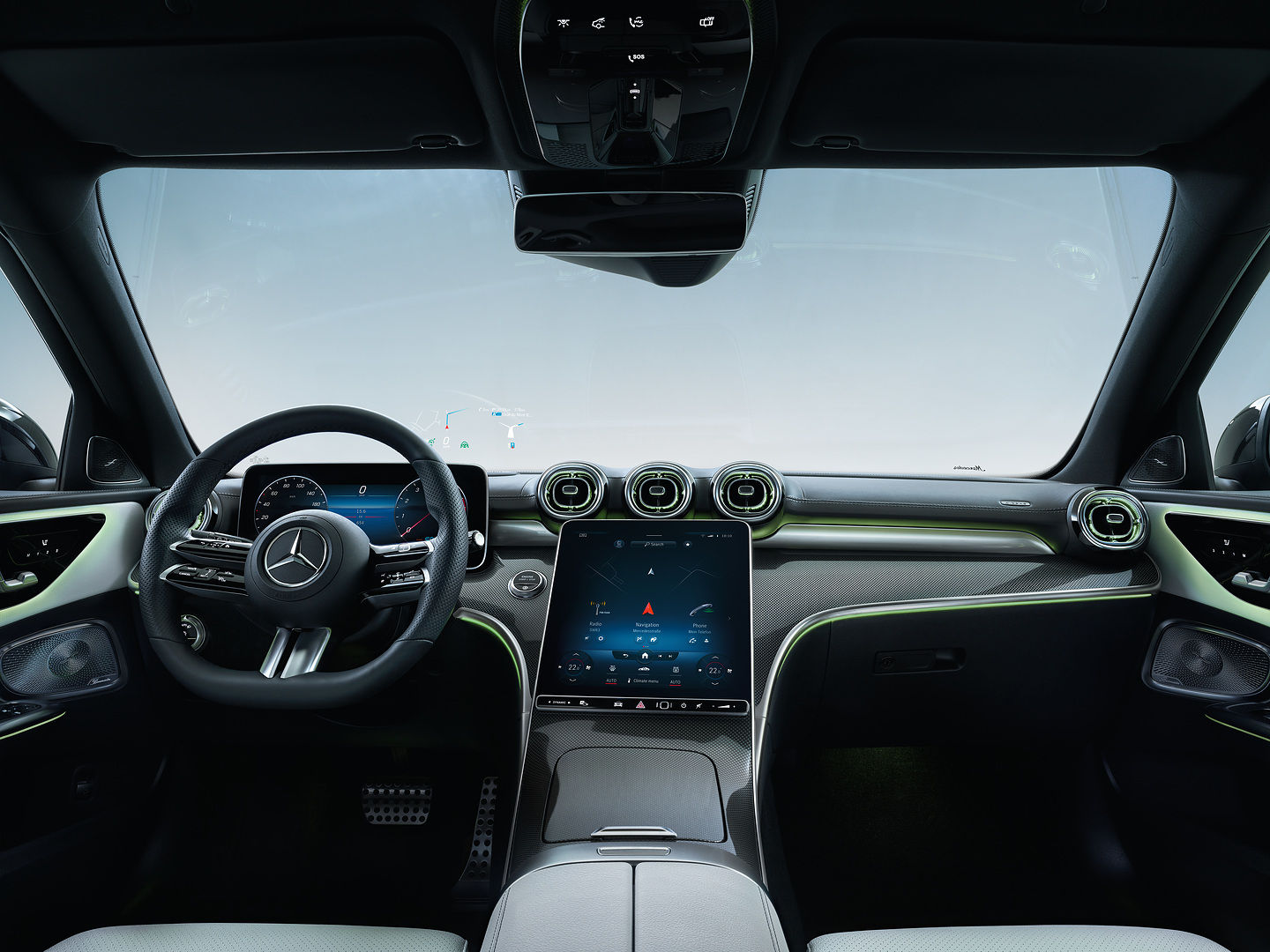 - У базовій комплектації новий С-Клас має світлодіодні фари головного освітлення підвищеної потужності. В якості опції для нього пропонуються фари DIGITAL LIGHT. У кожній з фар головного освітлення система DIGITAL LIGHT має світловий модуль з трьох надпотужних світлодіодів, що направляє світло за допомогою 1,3 млн мікроскопічних дзеркал. Таким чином, загальна роздільна здатність фар становить понад 2,6 млн пікселів. Як і панель приладів, поверхня дисплея також дещо повернена в бік водія.